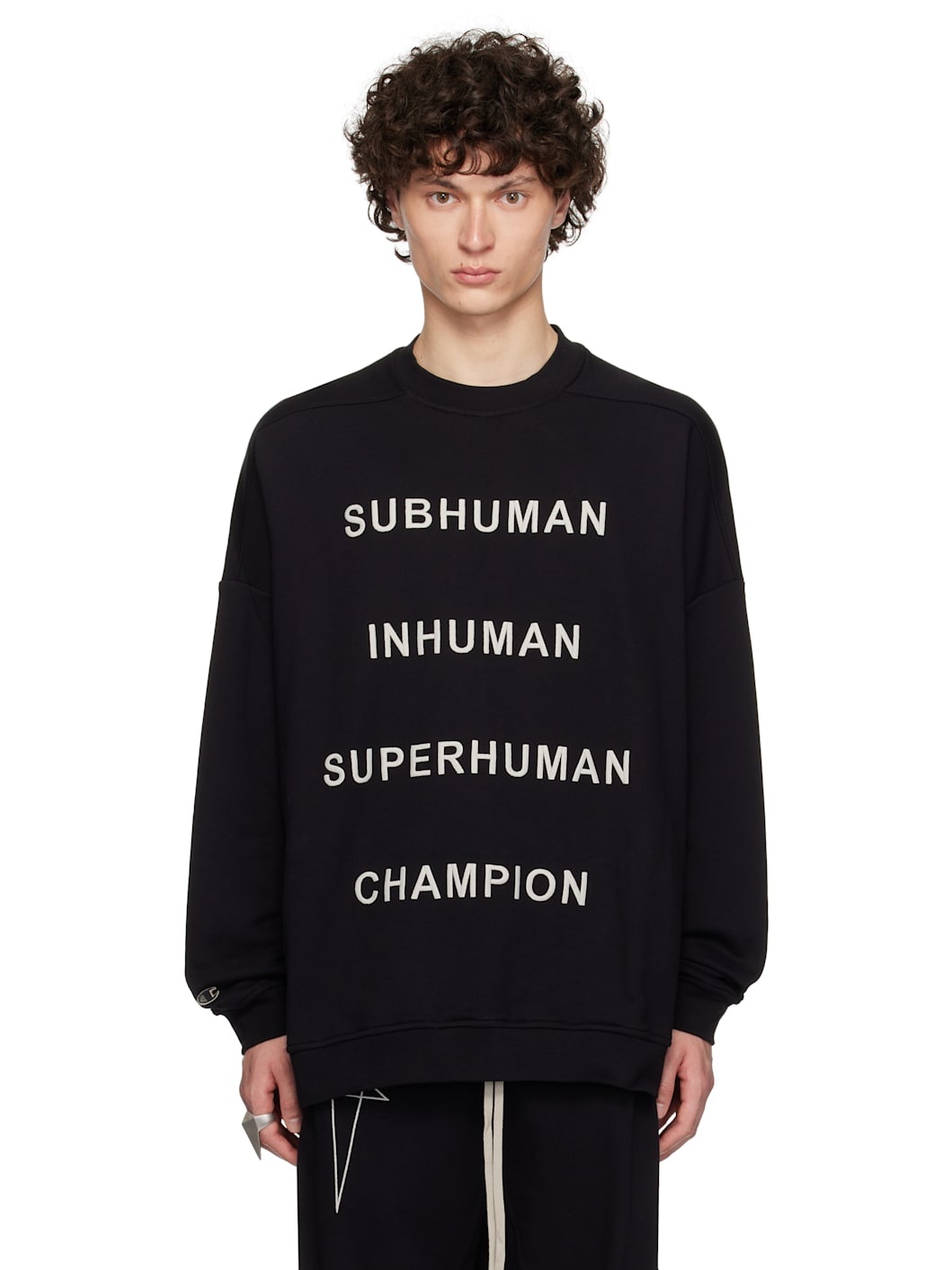 GOTS-certified organic cotton French terry sweatshirt. · Rib-knit crewneck, hem, and cuffs · Text and logo embroidered at front · Offset shoulder seams · Dropped shoulders · Embroidered logo patch at cuff · Central seam at back Part of the Rick Owens x Champion collaboration. Supplier color: Black Body: 100% organic cotton. Trim: 95% cotton, 5% elastane. Made in Italy 252232M204002