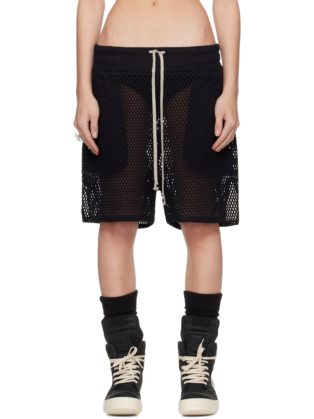 Semi-sheer GOTS-certified organic cotton mesh shorts. · Drawstring at elasticized waistband · Two-pocket styling · Dropped inseam · Vented outseams · Embroidered logo patch at back · Unlined Part of the Rick Owens x Champion collaboration. Supplier color: Black 100% organic cotton. Made in Italy 252232F088001