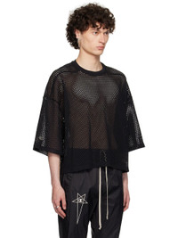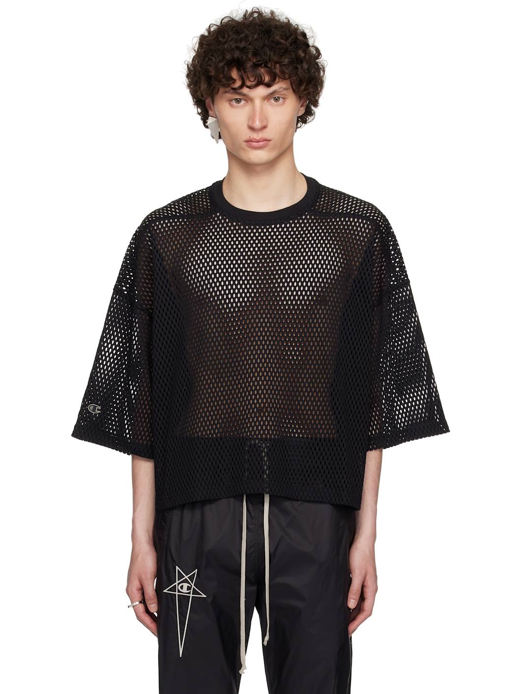 Semi-sheer GOTS-certified organic cotton mesh T-shirt. · Rib-knit crewneck · Cropped hem · Offset shoulder seams · Dropped shoulders · Embroidered logo patch at cuff Part of the Rick Owens x Champion collaboration. Supplier color: Black 100% organic cotton. Made in Italy 252232M213005