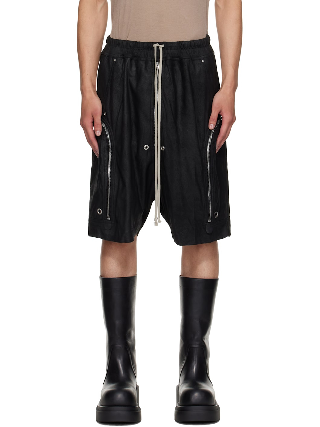 Lightweight grained lambskin shorts. · Subtle distressing throughout · Drawstring at elasticized waistband · Four-pocket styling · Exposed zip fly · Eyelets and press-studs at front · Zip pocket at outseams · Dropped inseam Supplier color: Black Body: 100% lambskin. Pocket lining: 100% cotton. Made in Italy 252232M193061