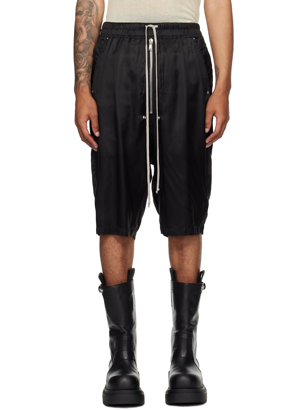 Lightweight cupro twill shorts. · Rivets and eyelets throughout · Drawstring at elasticized waistband · Four-pocket styling · Exposed zip fly · Creased legs · Dropped inseam · Silver-tone hardware Supplier color: Black 100% cupro. Made in Italy 252232M193027