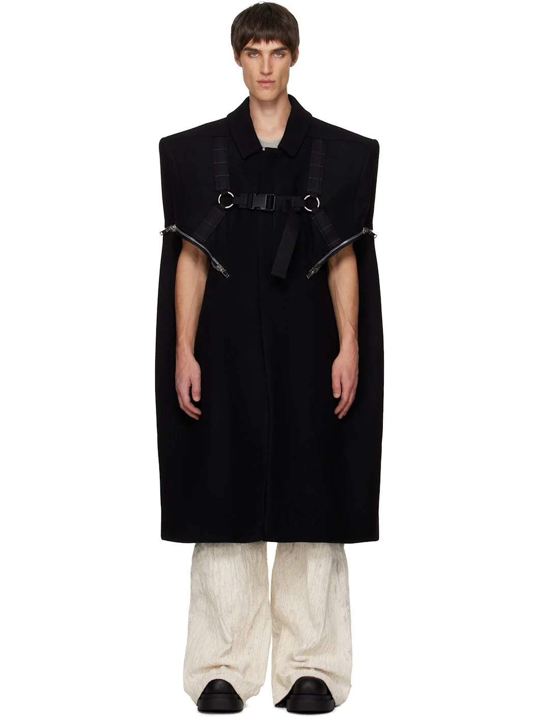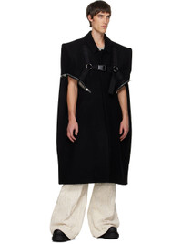 Virgin wool melton cape-style coat. · Spread collar · Concealed zip closure · Integrated harness-style webbing straps at front · Welt pockets at front · Two-way zip vent at side seams · Zip pockets at interior · Full cotton twill lining · Silver-tone hardware Supplier color: Black Body: 100% virgin wool. Lining: 100% cotton. Made in Italy 252232M176022