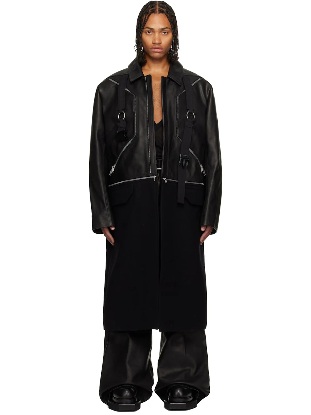Grained calfskin and virgin wool melton coat. · Vegetable-tanned leather · Paneled construction · Spread collar · Zip closure · Integrated harness-style webbing straps at front · Zip and flap pockets at front · Detachable zip panel at waist · Zip pockets at interior · Fully lined Supplier color: Black Body 1: 100% calfskin. Body 2: 100% virgin wool. Lining 1: 100% cotton. Lining 2: 100% cupro. Made in Italy 252232M181022