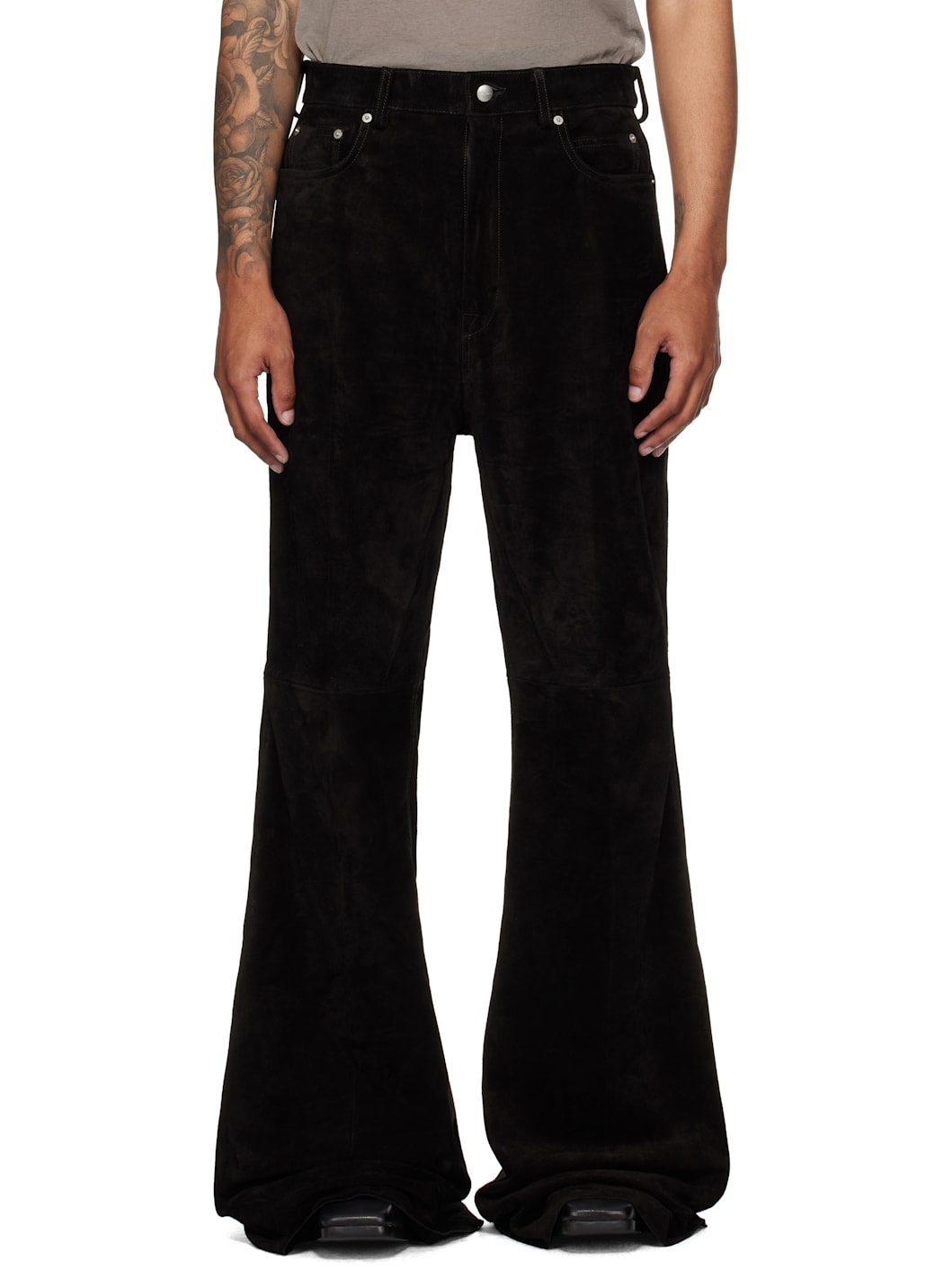 LWG-certified calfskin suede pants. · Flared, slim-fit · High-rise · Belt loops · Six-pocket styling · Zip fly · Raw edge at cuffs · Full cotton poplin lining Supplier color: Black Body: 100% calfskin. Lining: 100% cotton. Made in Moldova 252232M189002
