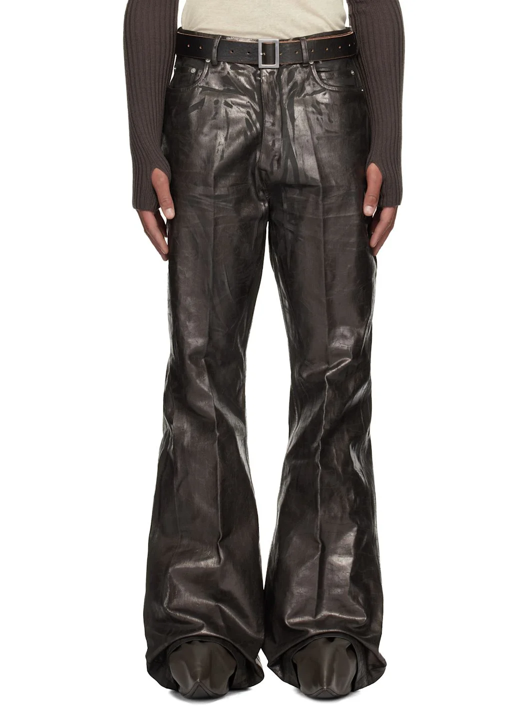 ZDHC-certified 13 oz non-stretch denim jeans. · Overdyed and foil-coated · Flared, slim-fit · High-rise · Belt loops · Six-pocket styling · Button fly · Creased legs · Silver-tone hardware Supplier color: Bronze Body: 100% cotton. Trim: 52% polyester, 48% cotton. Made in Italy 252232M186030