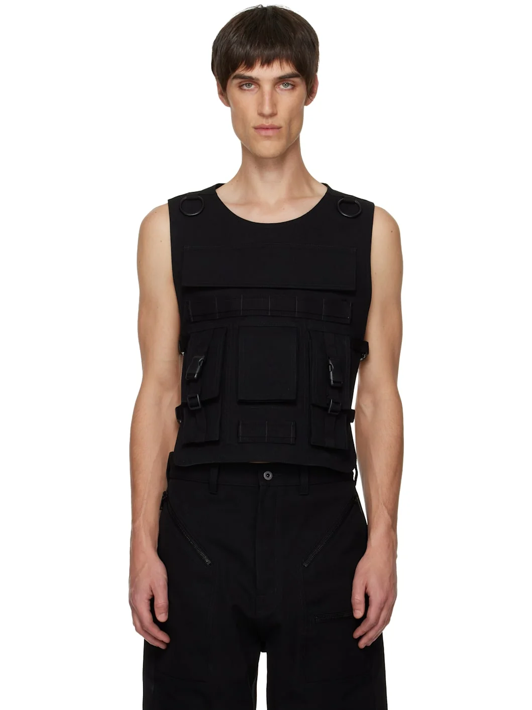 Cotton drill vest. · Webbing daisy chains throughout · Round neck · Flap pockets at front · Adjustable press-release fastenings at front and sides · O-ring at back shoulders · Full cotton poplin lining Part of the Rick Owens BONOTTO capsule. Supplier color: Black Body: 100% cotton. Trim: 100% polyester. Lining: 100% cotton. Made in Italy 252232M185007