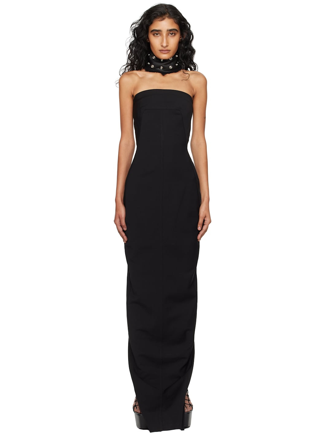 Plain-woven stretch cotton-blend maxi dress. · Paneled construction · Straight neck · Boning at bodice · Zip closure at back · Central vent at back hem · Partial stretch mesh lining Supplier color: Black Body: 91% cotton, 6% elastomultiester, 3% rubber. Lining: 84% polyamide, 16% elastane. Made in Italy 252232F055016