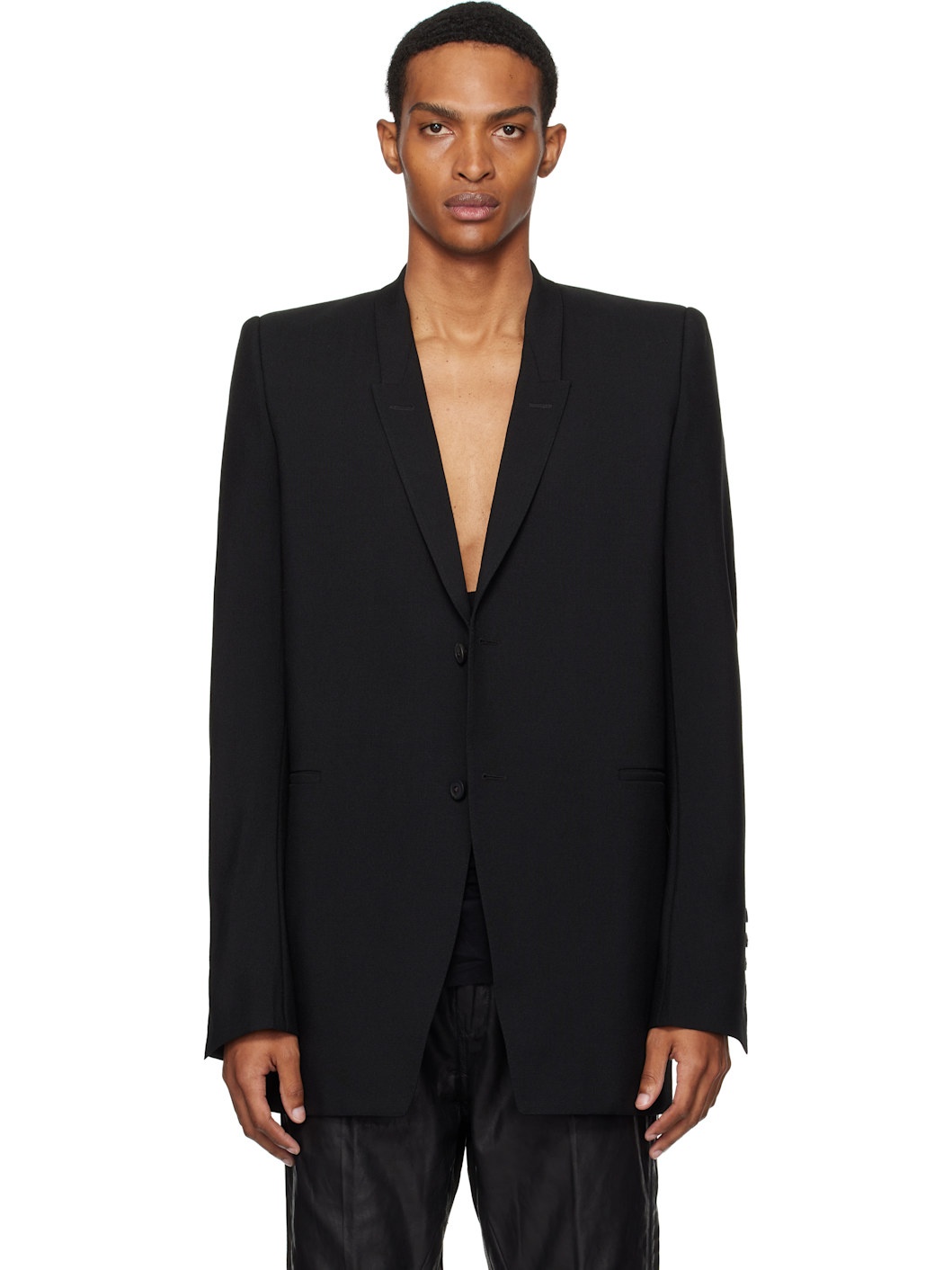 RWS-certified virgin wool grain de poudre blazer. · Peaked lapel · Button closure · Welt pockets · Padded shoulders · Surgeon's cuffs · Press-release strap at back · Central vent at back hem · Welt pockets at interior · Full twill and satin lining Supplier color: Black Body: 100% virgin wool. Lining 1: 100% cotton. Lining 2: 100% cupro. Made in Italy 252232M195002