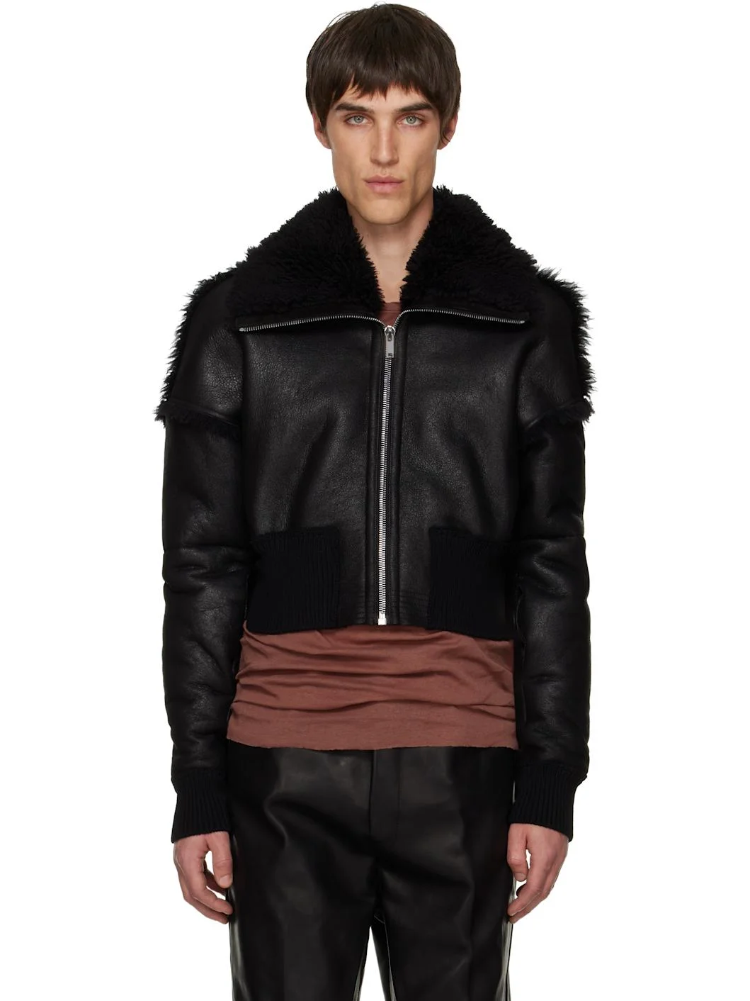 Grained lambskin jacket. · Fold-over funnel neck · Zip closure · Rib-knit hem and cuffs · Cropped hem · Dropped shoulders · Zip pocket at sleeve · Shearling interior Supplier color: Black Body: 100% lambskin. Trim 1: 94% virgin wool, 5% polyamide, 1% elastane. Trim 2: 100% calfskin. Trim 3: 100% cotton. Made in Moldova 252232M179013