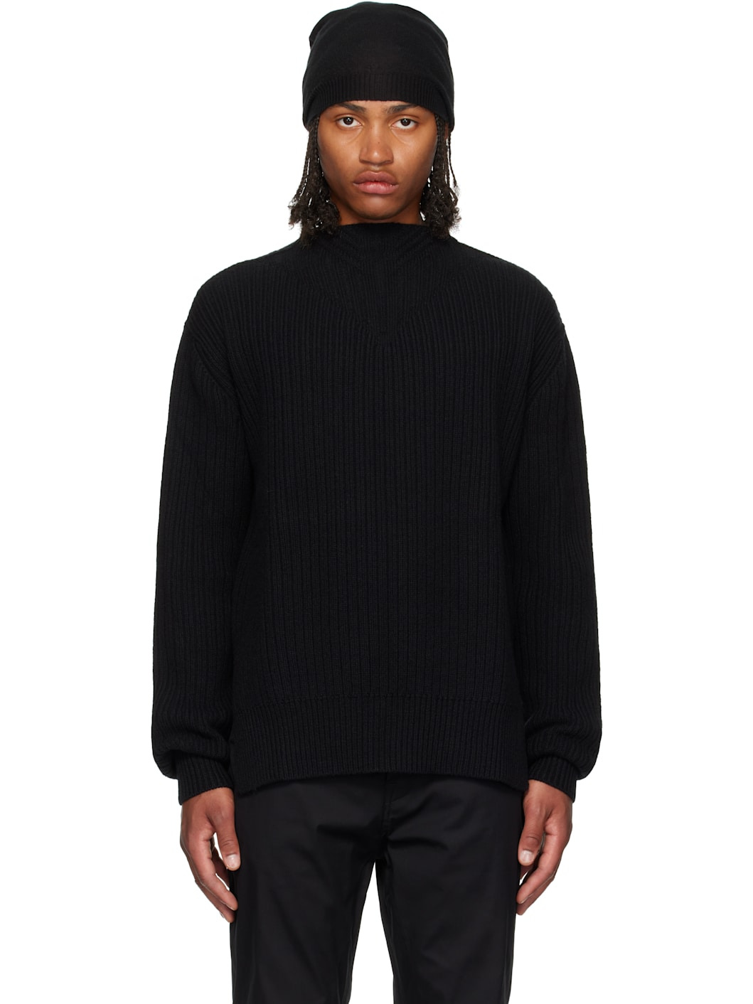 Rib-knit virgin wool sweater. · Mock neck · Vented side seams · Dropped shoulders · Central seam at back Supplier color: Black 100% virgin wool. Made in Italy 252232M201006