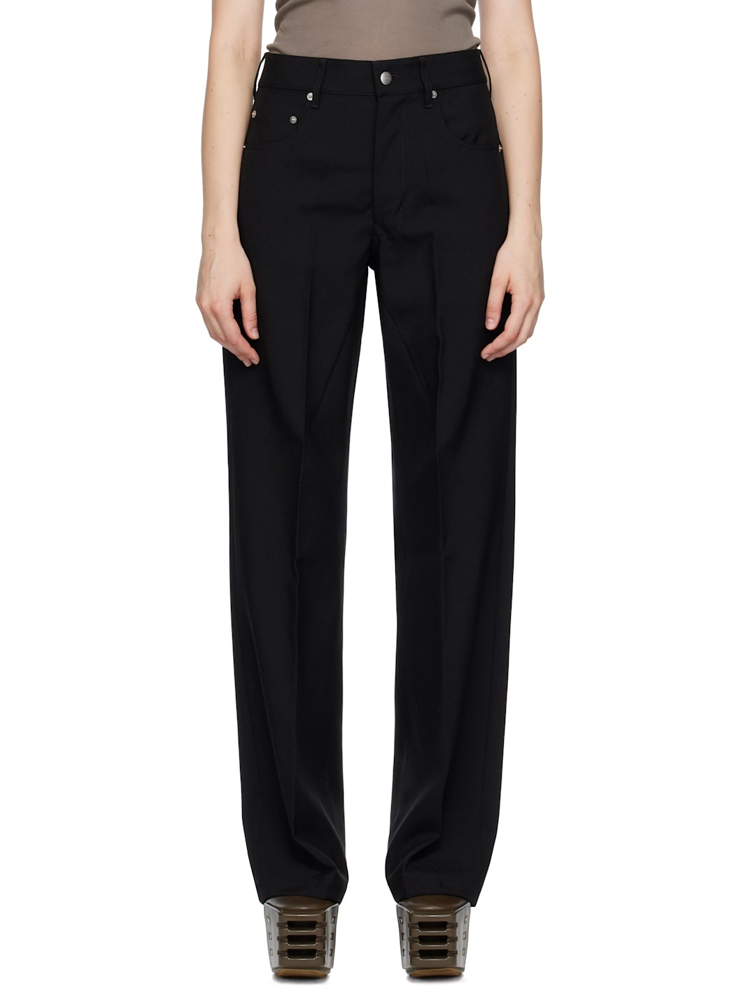 Virgin wool grain de poudre jeans. · RWS-certified virgin wool · Wide-leg · Low-rise · Belt loops · Five-pocket styling · Zip fly · Creased legs · Dart at inseams · Logo-engraved silver-tone hardware Supplier color: Black 100% virgin wool. Made in Italy 252232F069001