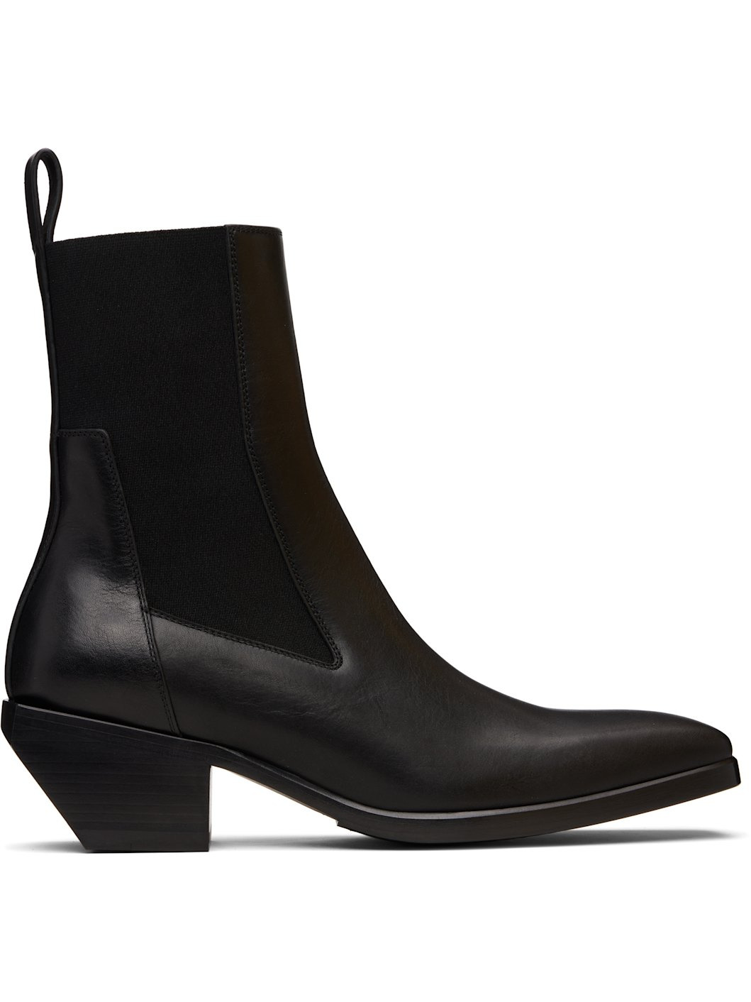 Ankle-high buffed leather Chelsea boots. · Square toe · Elasticized gusset at sides · Pull-loop at heel collar · Stacked leather heel with rubber injection · Leather sole · Heel: H2" Supplier color: Black/Black Upper: leather. Sole: leather, rubber. Made in Italy 252232M223009