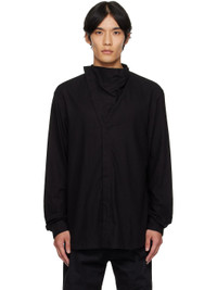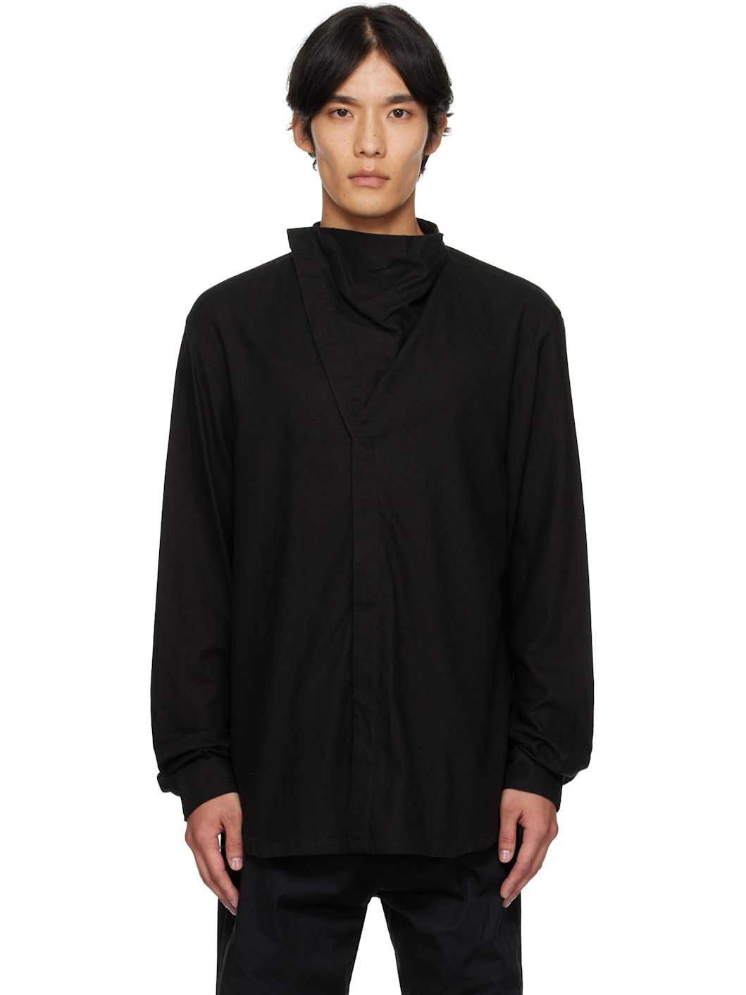 Organic cotton- and wool-blend brushed satin shirt. · Modified stand collar · Concealed offset button closure · Shirttail hem · Buttoned barrel cuffs Supplier color: Black 81% cotton, 19% wool. Made in Italy 252232M192022