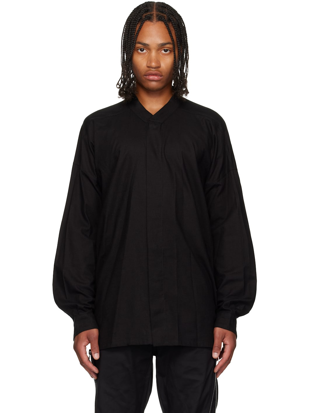 Brushed cotton- and wool-blend twill shirt. · GOTS-certified cotton and RWS-certified wool · Y-neck · Press-stud closure · Shirttail hem · Dropped shoulders · Press-stud barrel cuffs Supplier color: Black 81% cotton, 19% wool. Made in Italy 252232M192004