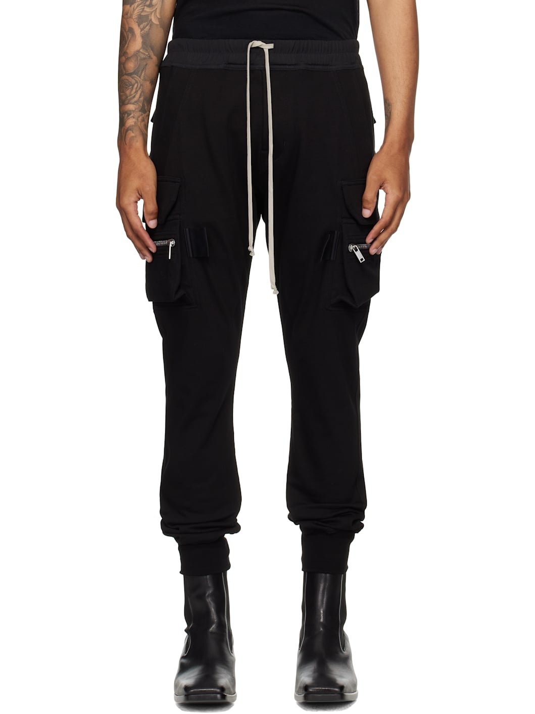 GOTS-certified stretch organic cotton poplin cargo pants. · Slim-fit · Drawstring at elasticized waistband · Four-pocket styling · Zip fly · Rib-knit cuffs · Flap and zip pocket at outseams Supplier color: Black 97% cotton, 3% elastane. Made in Italy 252232M188036
