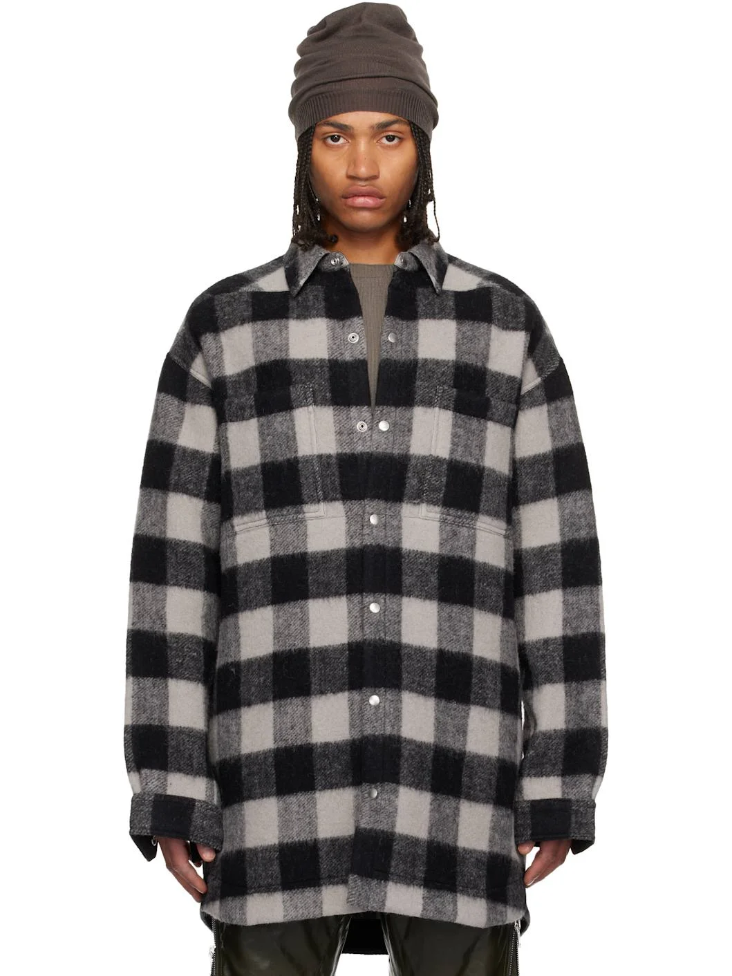 Oversized virgin wool melton overshirt. · RWS-certified virgin wool · Check pattern throughout · Spread collar · Press-stud closure · Flap pockets at chest · Seam pockets at waist · Shirttail hem · Dropped saddle shoulders · Press-stud barrel cuffs · Riveted webbing strap at back · Unlined · Silver-tone hardware Supplier color: Black plaid Body: 100% virgin wool. Trim 1: 100% cupro. Trim 2: 100% cotton. Made in Italy 252232M192043