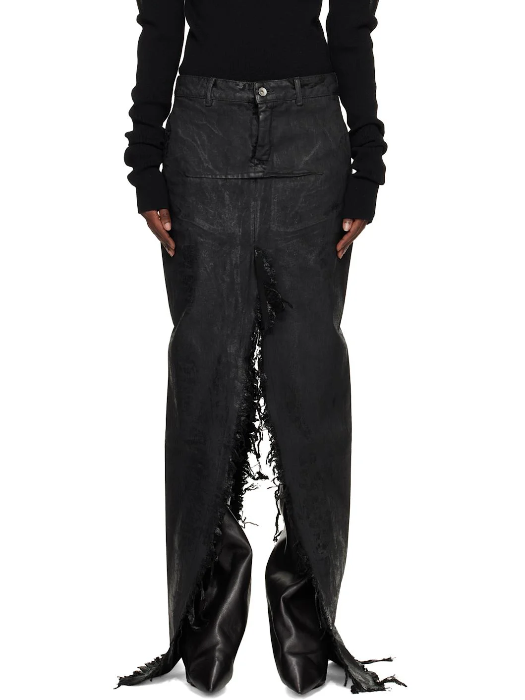 13 oz non-stretch denim maxi skirt. · ZDHC-certified denim · Overdyed, foil-coated, and waxed · Discoloration and frayed edges throughout · Belt loops · Two-pocket styling · Zip fly · Dart at front and back · Slit at front and back hem Supplier color: Black Body: 100% cotton. Trim: 52% polyester, 48% cotton. Made in Italy 252232F093021