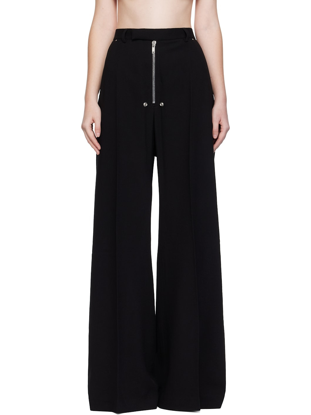 Virgin wool crepe trousers. · Wide-leg · Belt loops · Four-pocket styling · Exposed zip fly · Rivets, grommets, and press-stud hardware at front · Dropped inseam · Creased legs · Silver-tone hardware Supplier color: Black Body: 100% virgin wool. Trim: 100% cupro. Made in Italy 252232F087012
