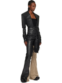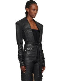 13 oz non-stretch denim jacket. · Foil-coated, overdyed, and waxed · Paneled construction · Open front · Wraparound self-tie straps at cropped hem · Raw edge at hem · Girdered and padded shoulders Supplier color: Black Body: 100% cotton. Trim: 91% cotton, 6% elastomultiester, 3% rubber. Made in Italy 252232F060000
