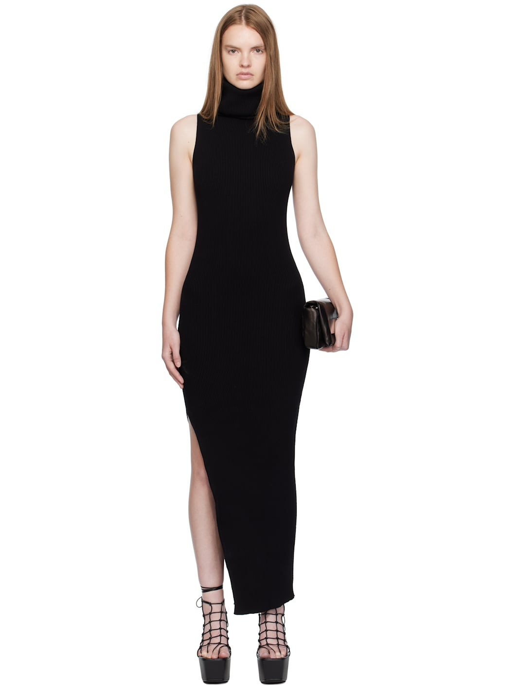Rib-knit viscose-blend maxi dress. · Turtleneck · Slit at side seam · Central garter-stitched stripe at back Supplier color: Black 68% viscose, 32% polyester. Made in Italy 252232F055006