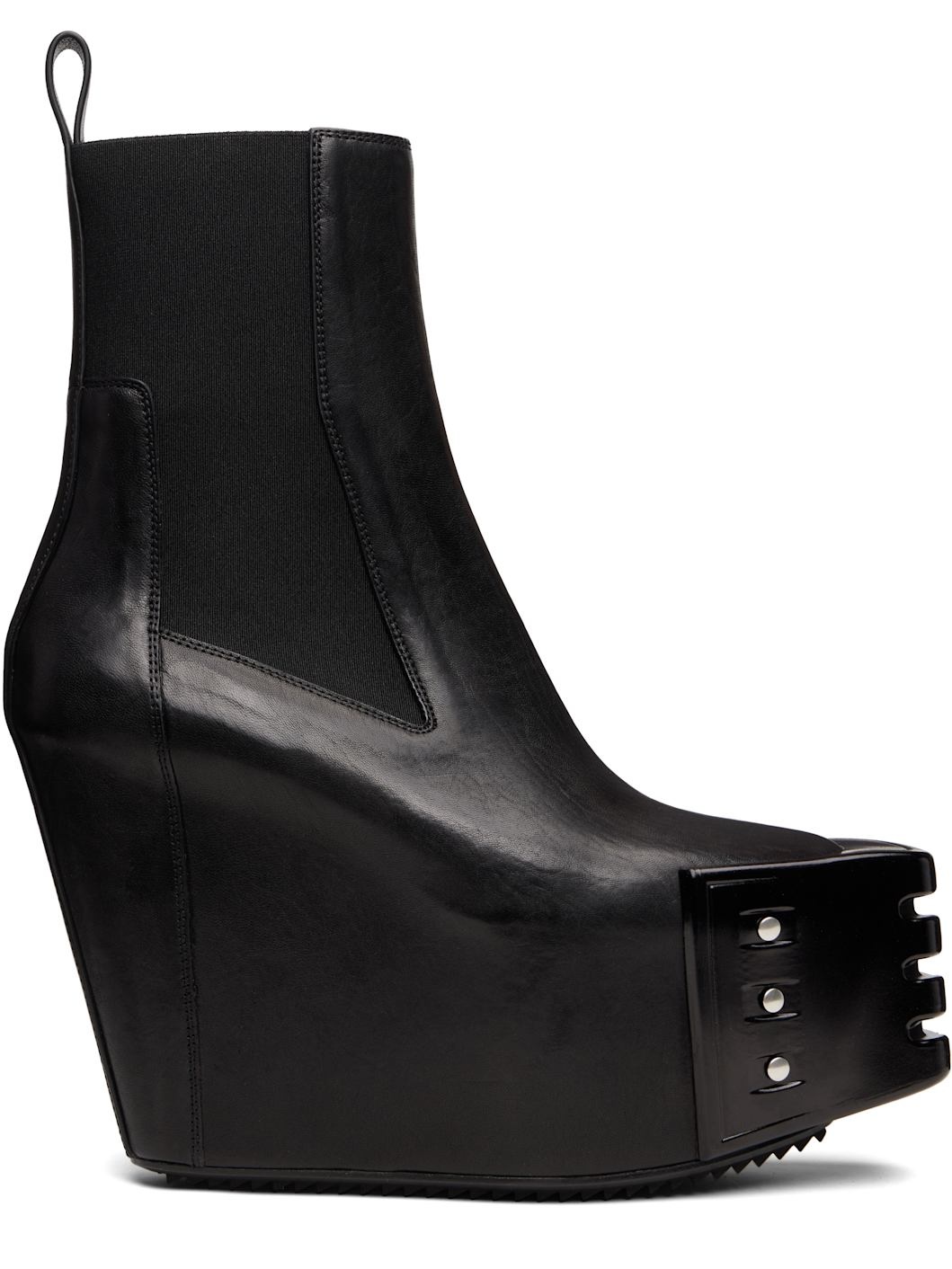 Ankle-high buffed leather Chelsea boots. · Studded plaque at square toe · Pull-loop at heel tab · Elasticized gusset at sides · Buffed leather lining · Wedge heel and leather-covered platform midsole · Treaded rubber sole · Platform: H3.5" · Heel: H5.5" Supplier color: Black Upper: leather. Sole: rubber. Made in Italy 252232M223002