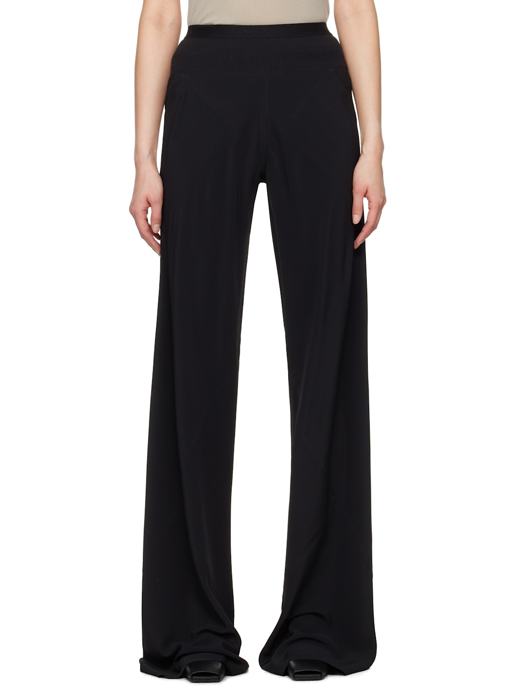 Lightweight acetate- and silk-blend crepe trousers. · Paneled construction · Rib-knit elasticized waistband · Two-pocket styling · Raw edge at cuffs Supplier color: Black 64% acetate, 36% silk. Made in Italy 251232F087012