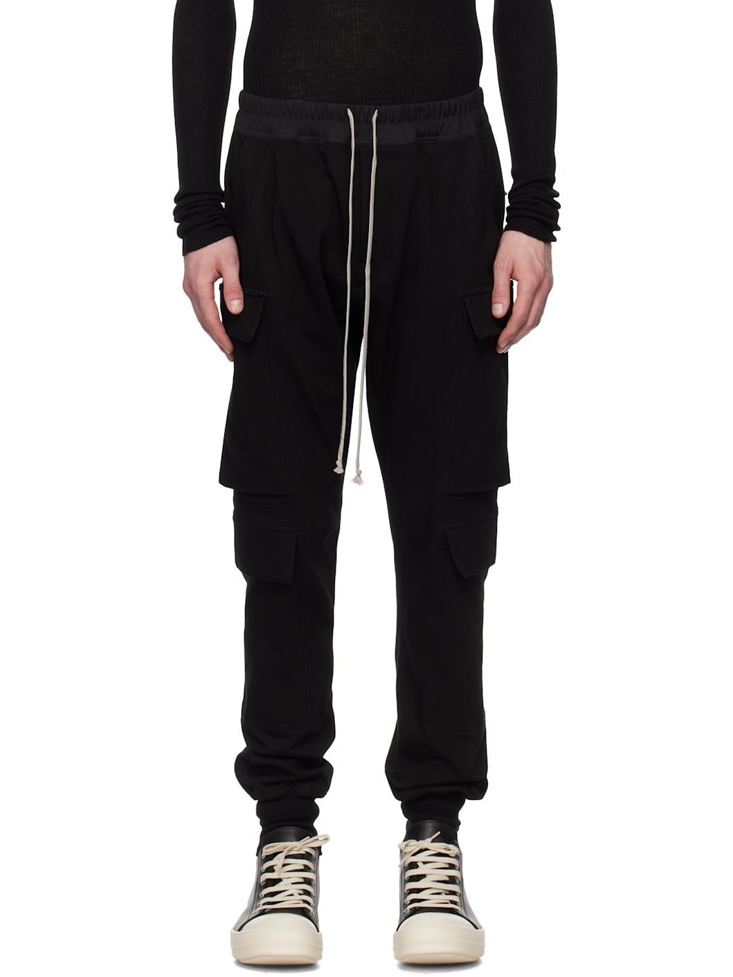 GOTS-certified organic cotton jersey cargo pants. · Drawstring at elasticized waistband · Four-pocket styling · Button fly · Rib-knit cuffs · Cargo pockets at outseams · Horn hardware Supplier color: Black Body: 100% organic cotton. Trim: 97% organic cotton, 3% elastane. Made in Italy 251232M188024