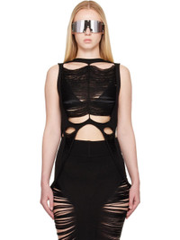 Semi-sheer knit virgin wool tank top. Laddering and rolled edges throughout. · Crewneck · Extended trim at front and back hem Supplier color: Black 100% virgin wool. Made in Italy 251232F111095