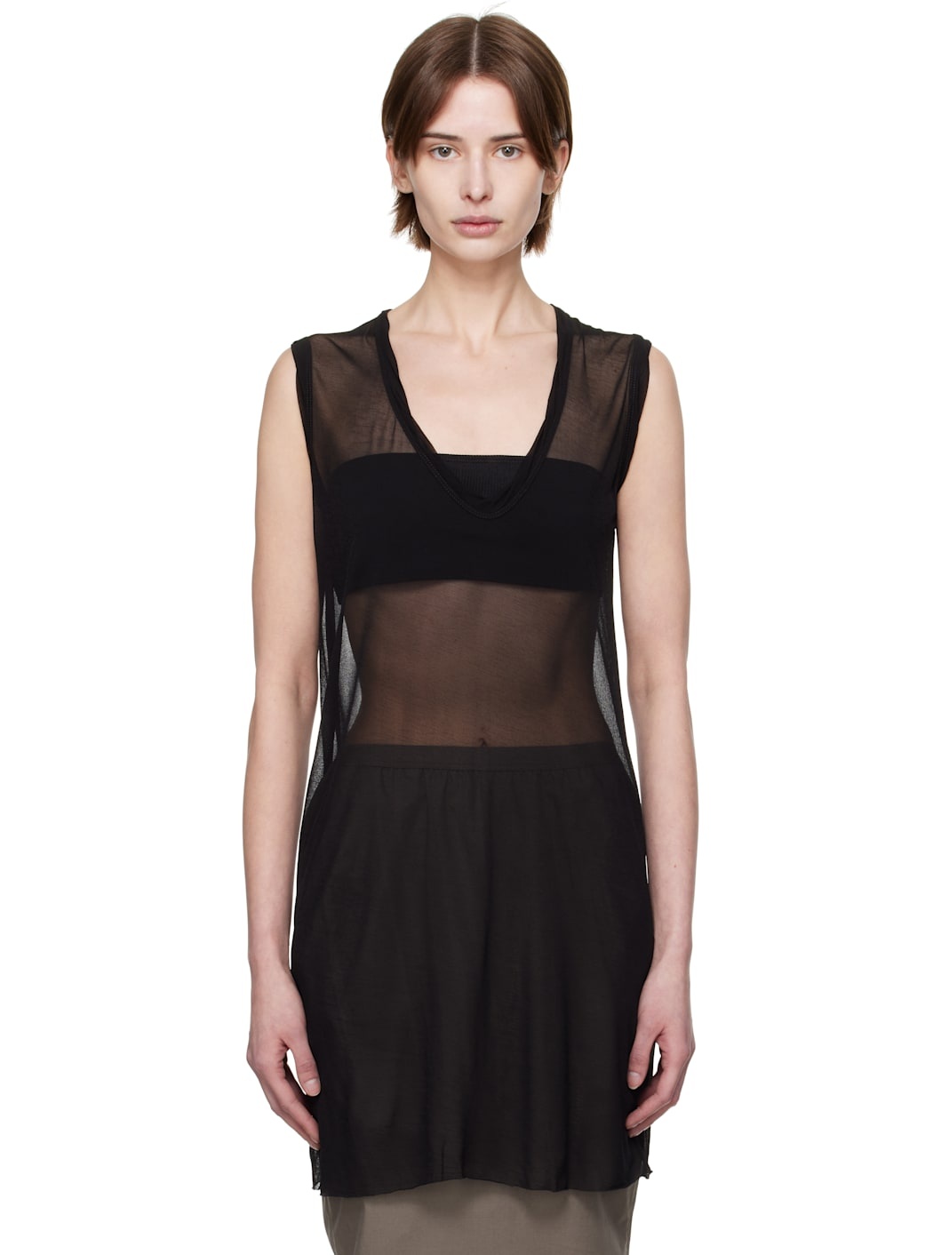 Semi-sheer viscose crepe jersey tank top. · V-neck · Raw edge at hem · Asymmetric central seam at back Supplier color: Black 100% viscose. Made in Italy 251232F111068