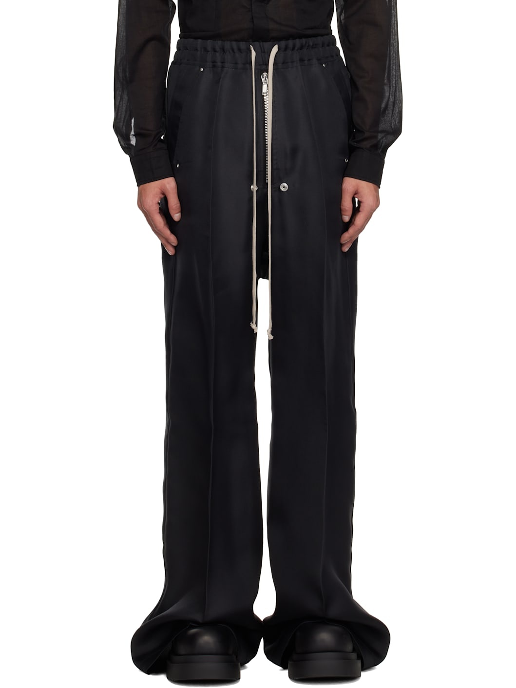 Wide-leg silk gazar trousers. · Drawstring at elasticized waistband · Four-pocket styling · Exposed zip fly · Rivets, grommets, and press-stud hardware at front · Creased legs · Dropped inseam Supplier color: Black 100% silk. Made in Italy 251232M191060
