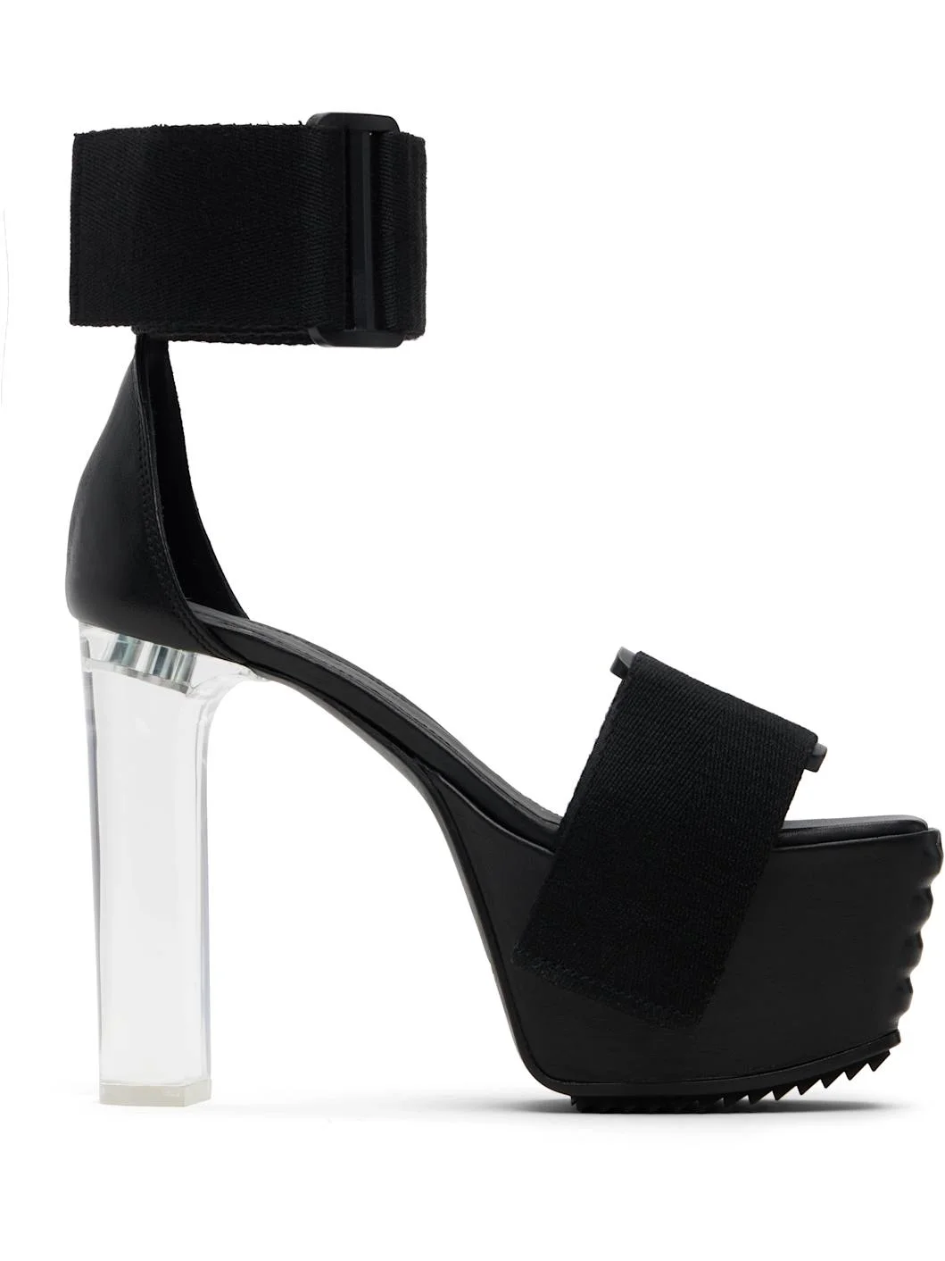 Webbing heeled sandals. · Open square toe · Velcro strap at vamp and ankle · Logo embossed at padded footbed · Transparent plexiglass block heel with rubber injection · Covered platform midsole · Treaded rubber sole · Platform: H2.5" · Heel: H5" Supplier color: Black/Clear Upper: textile. Sole: rubber. Made in Italy 252232F125002