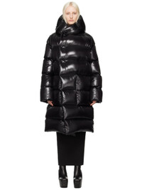 Down-filled quilted recycled nylon satin coat. · Hood at funnel neck · Offset concealed press-stud closure · Welt pockets · Inset rib knit virgin wool cuffs · Webbing strap at back yoke · Zip pockets at interior · Fully lined Supplier color: Black Fill: 90% goose down, 10% mallard feathers. Body: 100% recycled polyamide. Trim 1: 100% virgin wool. Trim 2: 97% cotton, 3% elastane. Made in Italy 242232F061000