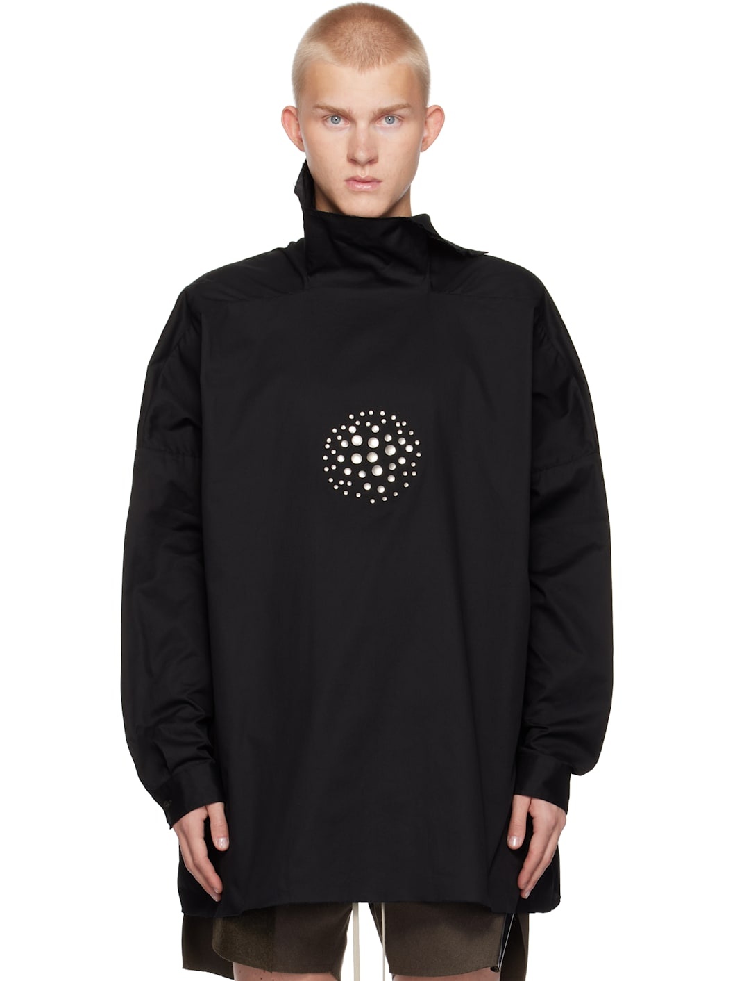 GOTS-certified organic cotton twill shirt. · Raw edge at funnel neck and shirttail hem · Studded graphic at front · Dropped shoulders · Single-button barrel cuffs · Three-button placket at back collar · Buffalo horn hardware Supplier color: Black Body: 100% cotton. Trim: 100% buffalo horn. Made in Italy 242232M205029