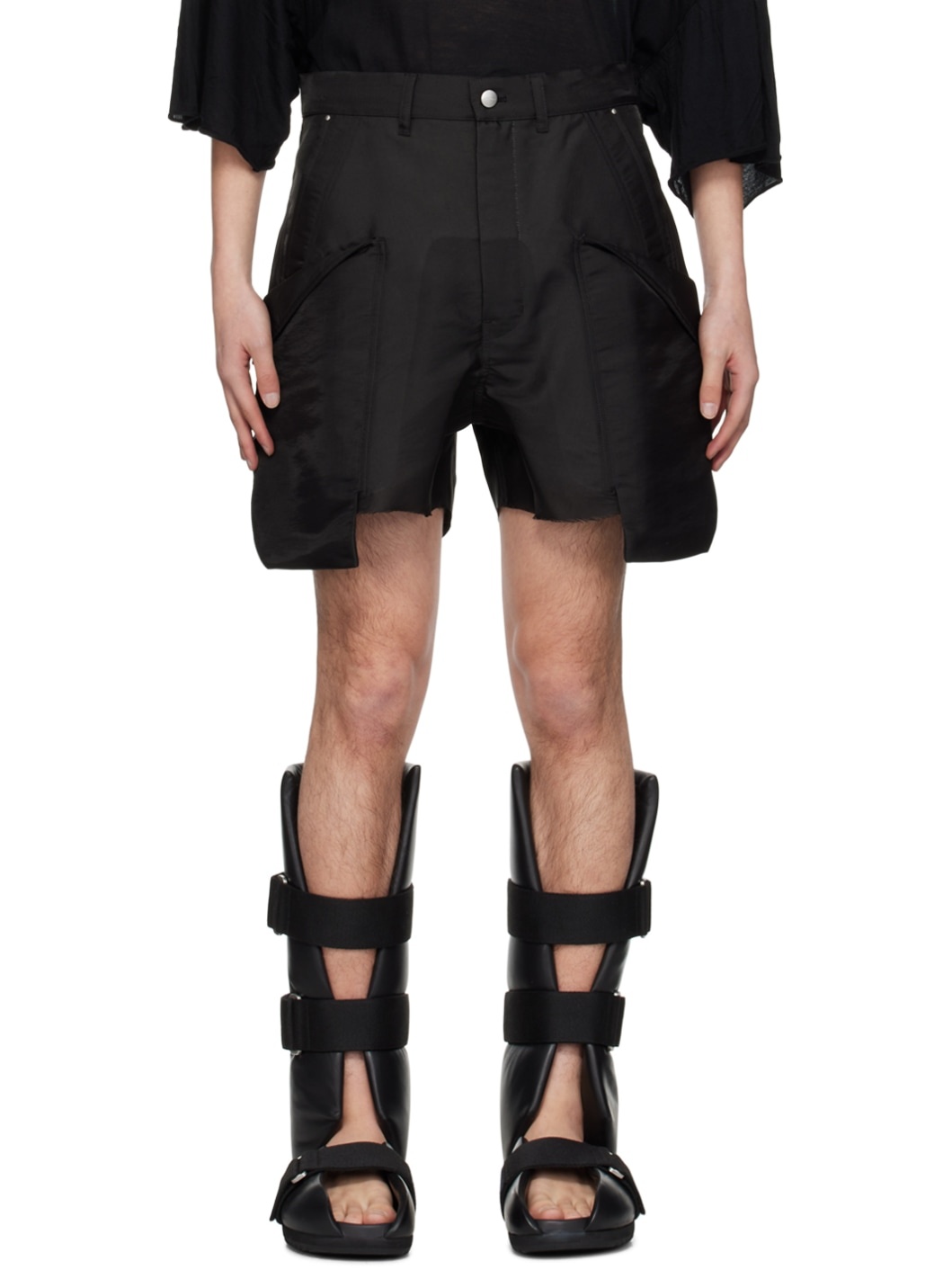 Loose-fit semi-sheer silk-blend broadcloth shorts. · Low-rise · Belt loops · Four-pocket styling · Zip-fly · Raw edge at cuffs · Cargo pocket and hammer loops at outseams · Unlined Supplier color: Black 86% silk, 14% polyamide. Made in Italy 241232M193045