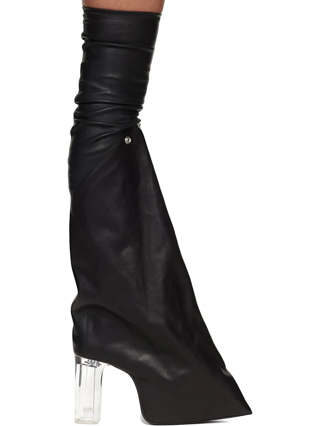 Thigh-high stretch buffed lambskin and grained calfskin boots. · Pointed toe · Press-stud hardware at vamp · Elasticized collar · Plain-woven and buffed calfskin lining · Transparent plexiglass block heel · Covered platform midsole · Leather sole with rubber injection · Platform: H3" · Heel: H4.5" Supplier color: Black/Clear Upper: lambskin, calfskin. Sole: leather, rubber. Made in Italy 252232F115008