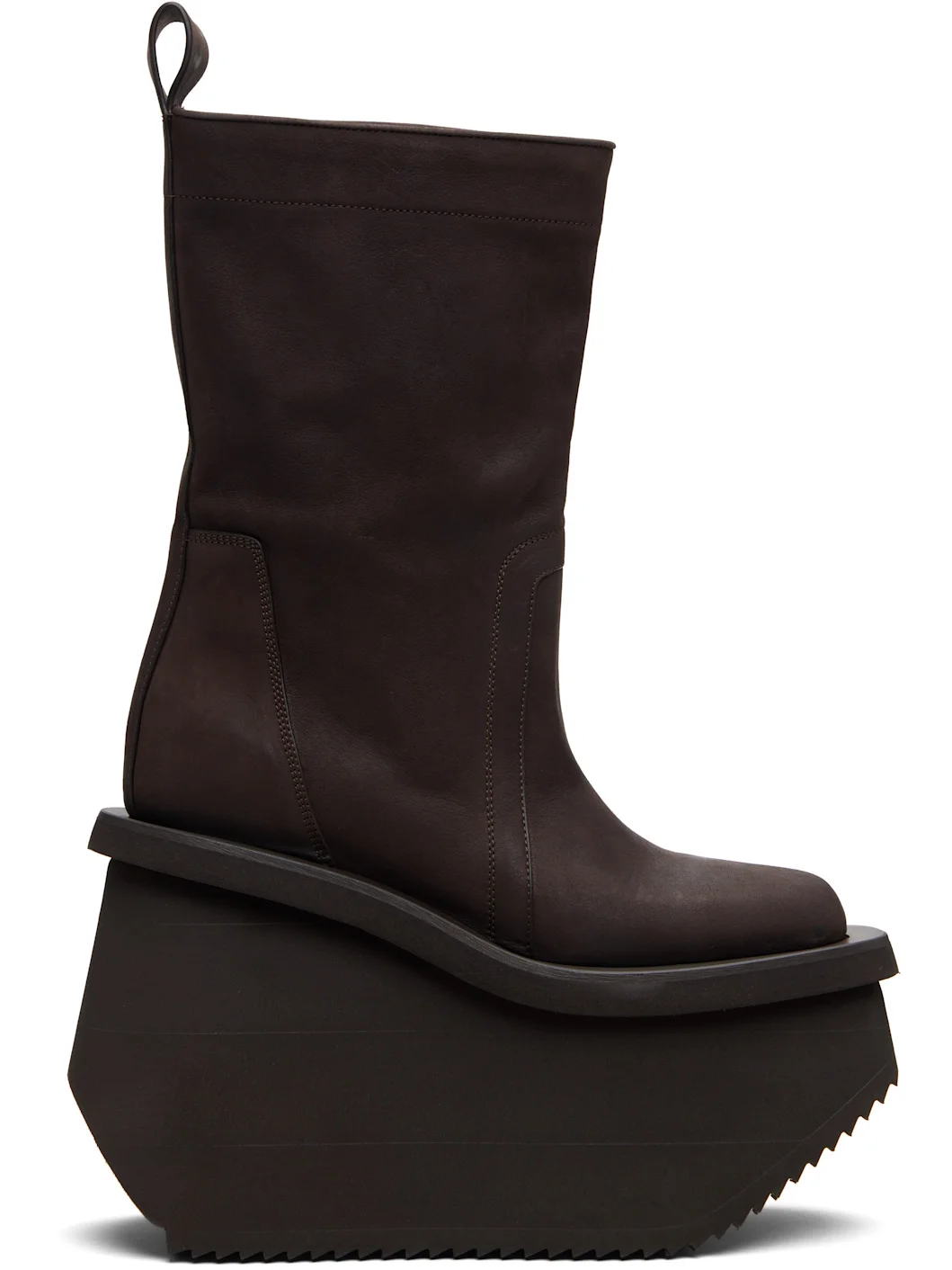 Mid-calf LWG-certified calfskin nubuck boots. · Square toe · Pull-loop at heel collar · Calfskin suede lining · Foam rubber platform midsole · Treaded rubber sole · Platform: H4" · Heel: H5.5" Supplier color: Brown Upper: calfskin. Sole: rubber. Made in Italy 252232M223025