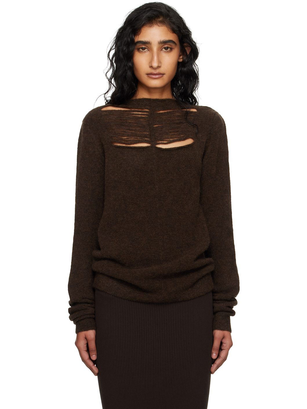 Rib-knit stretch alpaca-blend sweater. · Boatneck · Laddering at chest · Central garter stitch stripe at back Supplier color: Brown 45% alpaca, 30% polyamide, 20% wool, 2% elastane. Made in Italy 252232F096001