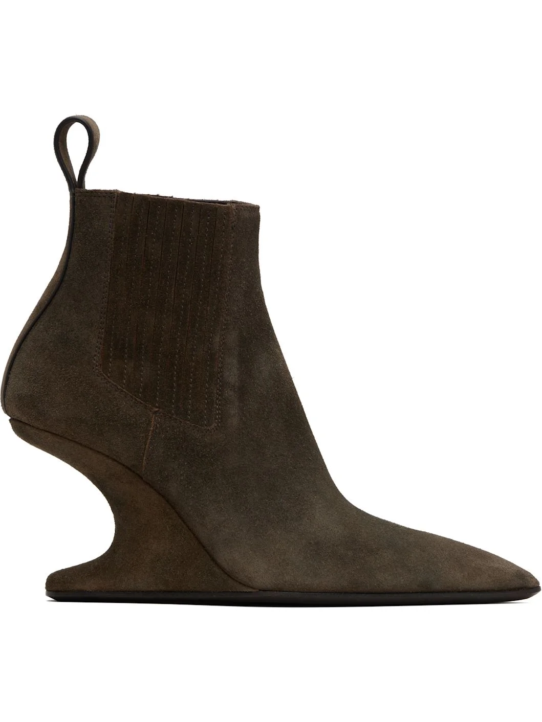 Ankle-high suede boots. · Pointed toe · Covered elasticized gusset at sides · Pull-loop at heel collar · Covered modified wedge heel · Leather sole with rubber injections · Heel: H3.25" Supplier color: Indigo Upper: leather. Sole: leather, rubber. Made in Italy 252232F113011