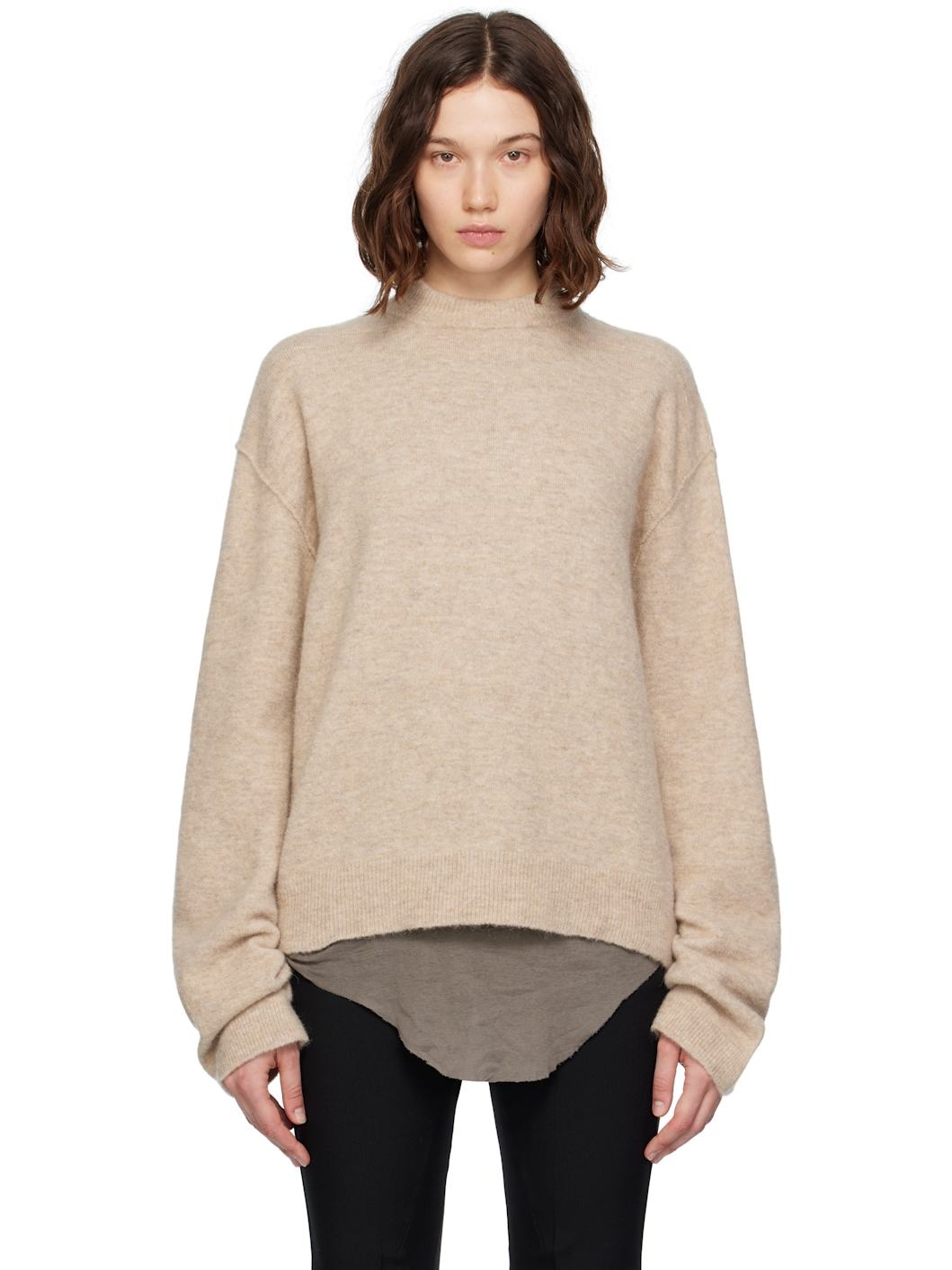 Knit stretch alpaca- and nylon-blend sweater. · Rib-knit crewneck, hem, and cuffs · Raised seam at dropped shoulders · Central garter-stitch stripe at back Supplier color: Khaki brown 48% alpaca, 30% nylon, 20% wool, 2% elastane. Made in Italy 252232F096006