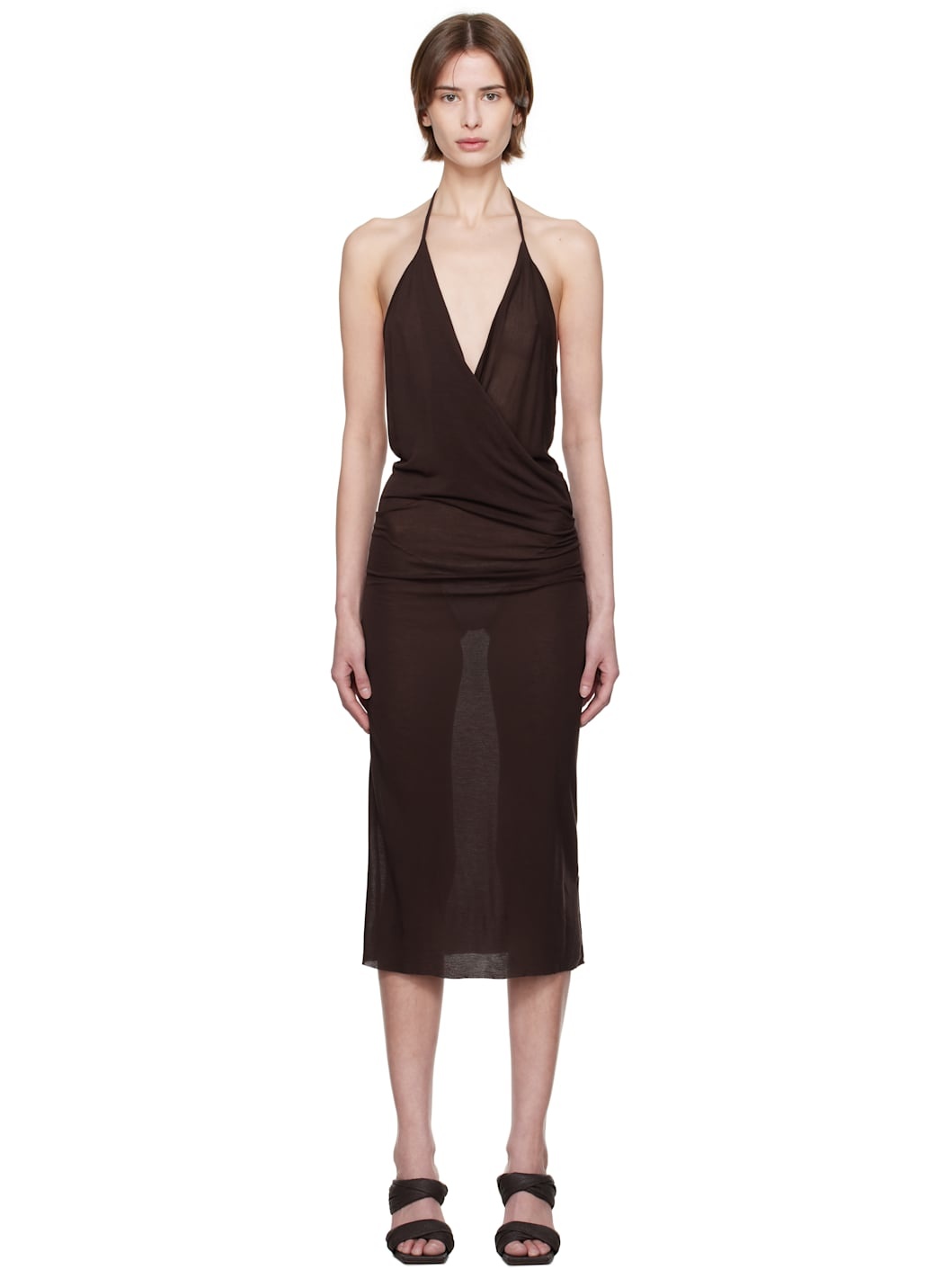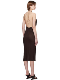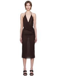 FSC-certified viscose- and silk-blend jersey midi dress. Draping throughout. · Semi-sheer · Cowl neck · Raw edge at hem · Fixed halter strap · Open back Supplier color: Mahogany 88% viscose, 12% silk. Made in Italy 251232F054008