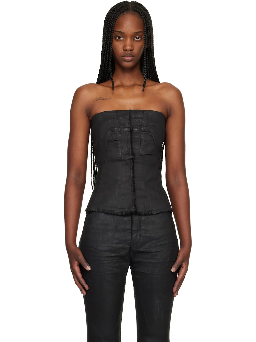 Overdyed 10 oz stretch denim top. · ZDHC-certified coating · Paneled construction · Straight neck · Frayed edge at front and hem · Zip closure at back · Logo-woven strap at interior · Stretch nylon mesh bustier-style lining Supplier color: Black Body: 91% cotton, 6% elastomultiester, 3% rubber. Lining: 84% polyamide, 16% elastane. Made in Italy 261126F111013