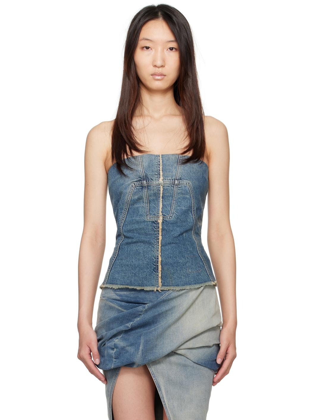 13 oz non-stretch selvedge denim top. Fading throughout. · ZDHC-certified · Garment-washed · Paneled construction · Straight neck · Frayed edge at front and hem · Zip closure at back · Partial double-cloth mesh lining Supplier color: Washed indigo Body: 100% cotton. Lining: 84% nylon, 16% elastane. Made in Italy 251126F111017