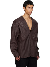 Oversized 10 oz stretch denim shirt. · Overdyed and waxed · V-neck · Concealed press-stud closure · Welt pockets at chest · Shirttail hem · Pleats at press-stud cuffs · Eyelets at underarms · Riveted webbing strap at back · Integrated logo-woven strap at interior · Unlined Supplier color: Scab wax Body: 91% cotton, 6% elastiomultiester, 3% rubber. Made in Italy 252126M192002