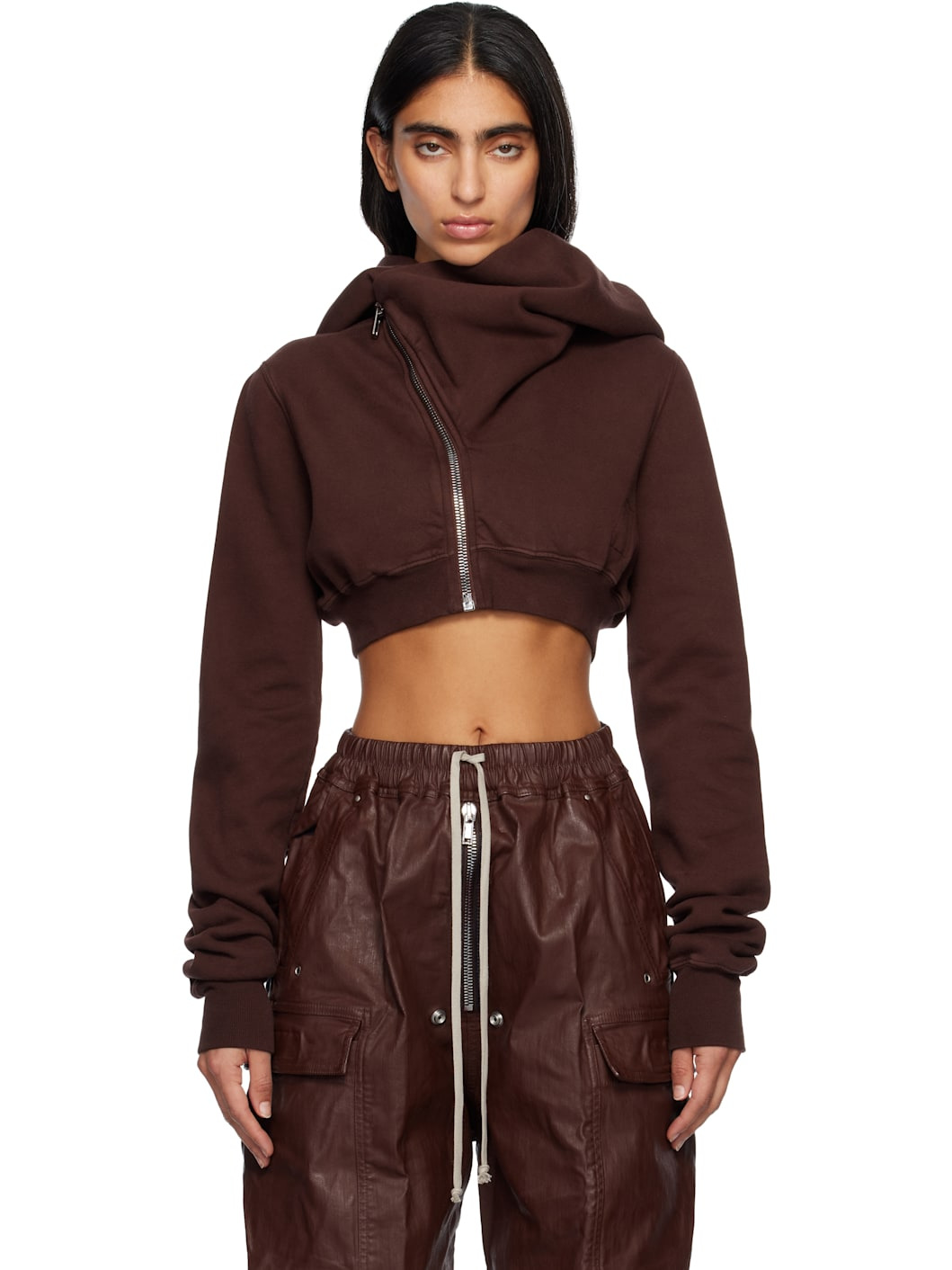Heavyweight organic cotton fleece hoodie. · Garment-dyed · GOTS-certified cotton · Funnel neck · Offset zip closure · Rib-knit hem and cuffs · Cropped hem · Central seam at back · Integrated logo-woven strap at interior Supplier color: Scab 100% organic cotton. Made in Italy 252126F097016