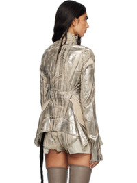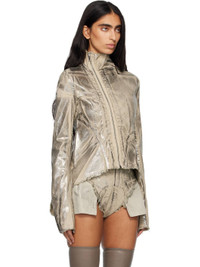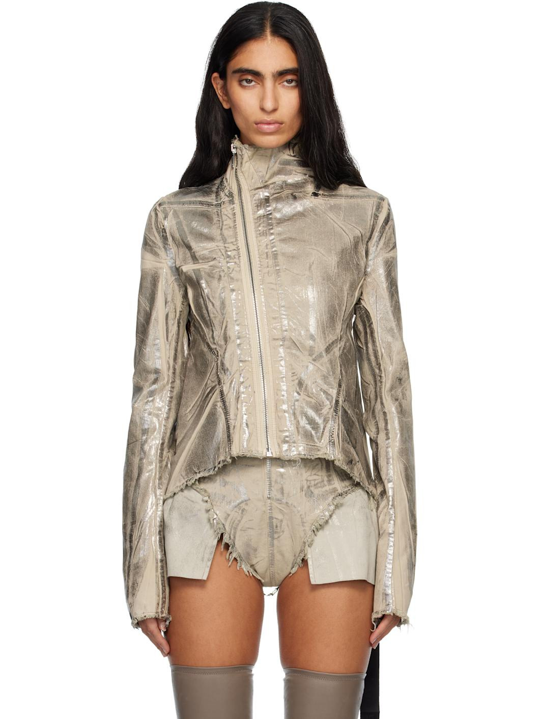 Foil-coated stretch denim jacket. · Fading throughout · Frayed edge at stand collar, hem, and cuffs · Offset zip closure · Curved hem · Integrated logo-woven strap at interior Supplier color: Palladium 90% cotton, 7% polyester, 3% rubber fibre. Made in Italy 252126F060000