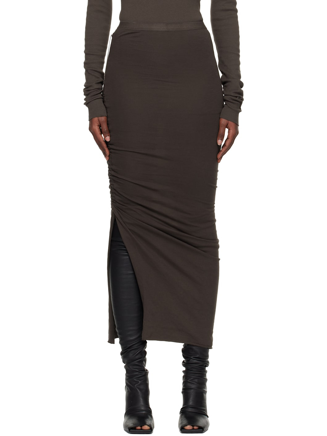 GOTS-certified organic cotton jersey midi skirt. · Garment-dyed · Elasticized waistband · Rolled edge at hem · Ruching and drawstring at vented side seam Supplier color: Dark dust 100% cotton. Made in Italy 252126F092000
