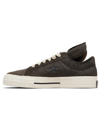 Low-top hair-on leather sneakers. · Lace-up closure · Logo patch at extended tongue · Inset logo at sides · Padded collar · Rubber logo patch at heel counter · Treaded rubber sole Part of the Rick Owens Drkshdw x Converse collaboration. Supplier color: Dark dust/Black Upper: leather. Sole: rubber. Made in Viet Nam 261126F128000