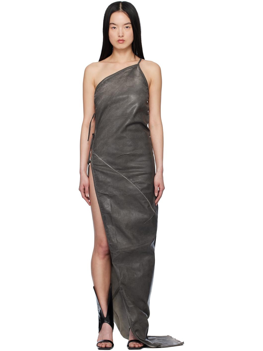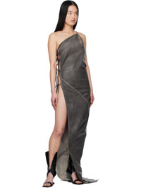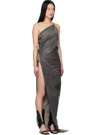 Foil-coated stretch denim maxi dress. Fading throughout. · Overdyed · Single-shoulder construction · Self-tie drawstrings at open side seam · Slit at side seam · Raw edge at asymmetrical hem · Train at back · Integrated logo-woven webbing strap at interior Supplier color: Drkdust 90% cotton, 7% polyester, 3% rubber. Made in Italy 251126F055004