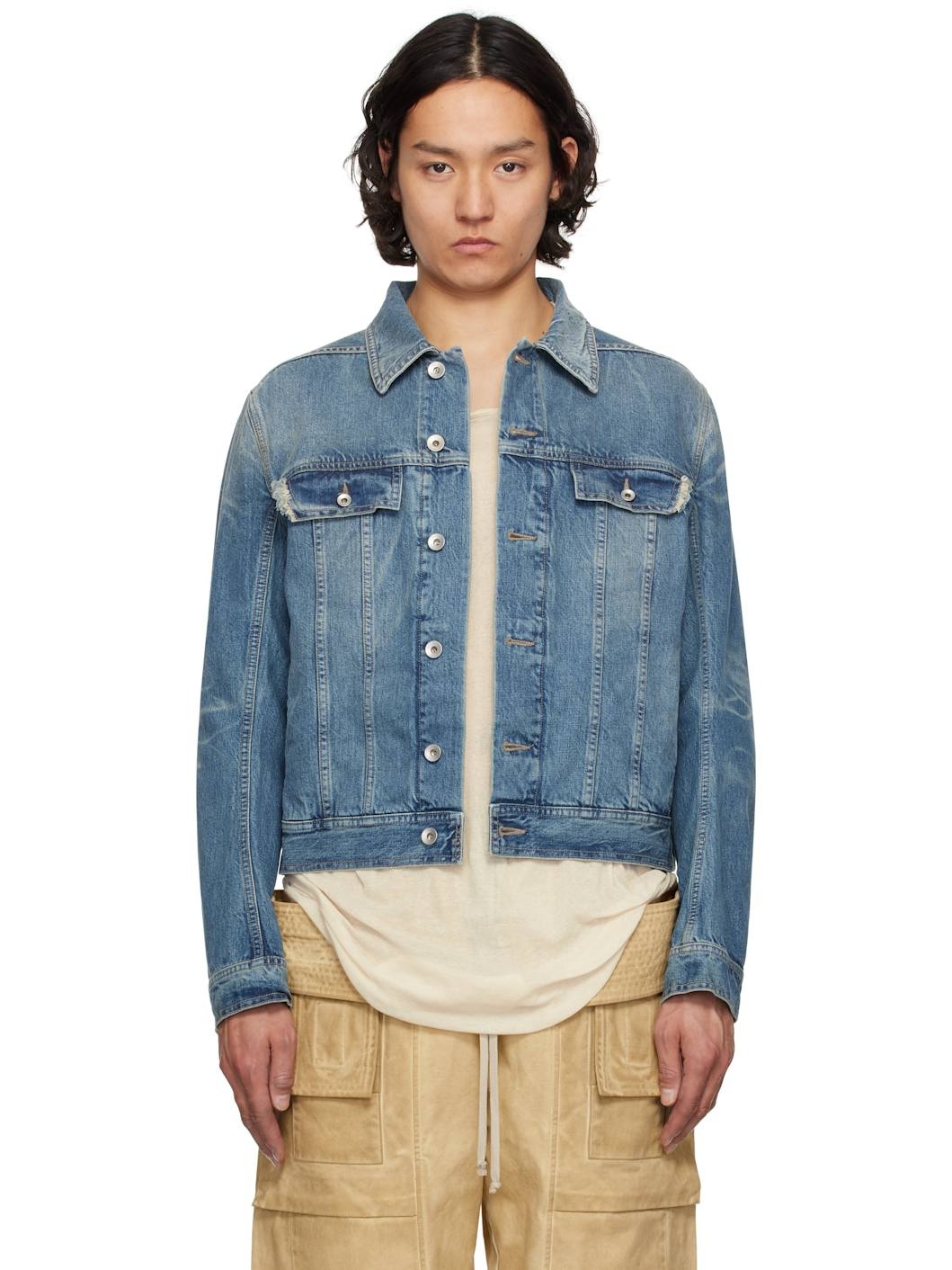 Washed 13 oz non-stretch selvedge denim jacket. Fading, distressing, and whiskering throughout. · ZDHC-certified · Spread collar · Button closure · Flap and welt pockets · Adjustable button fastening at cuffs · Adjustable button tabs at back hem · Logo-woven webbing strap at interior · Silver-tone hardware · Contrast stitching in beige Supplier color: Washed indigo 100% cotton. Made in Italy 251126M177002
