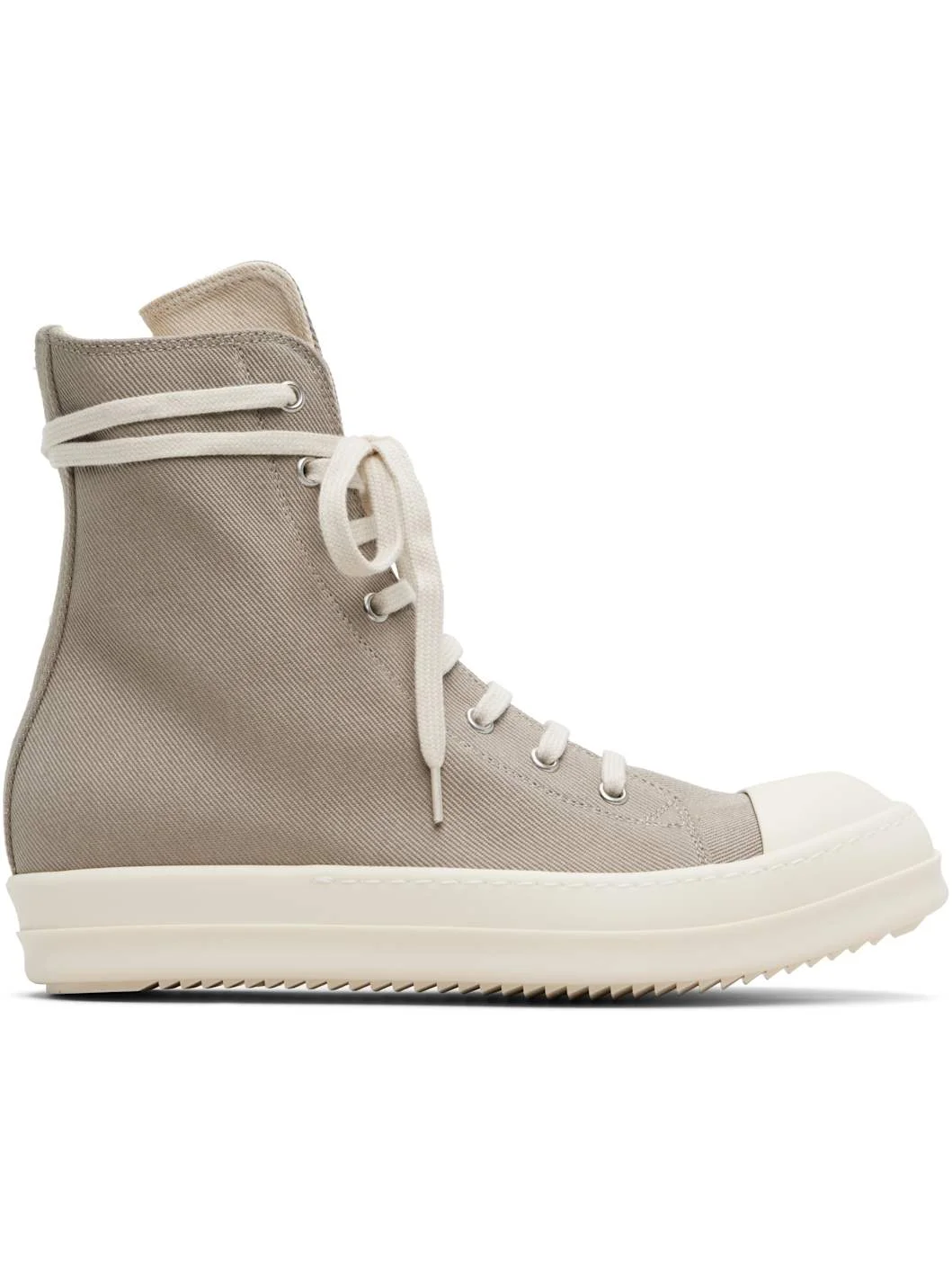 High-top overdyed 13 oz non-stretch organic cotton denim sneakers. · GOTS-certified organic cotton · Rubber cap toe · Lace-up closure · Zip closure and grommets at inner side · Rubber sole Supplier color: Pearl/Pearl/Milk Upper: organic cotton. Sole: rubber. Made in Italy 252126M236031